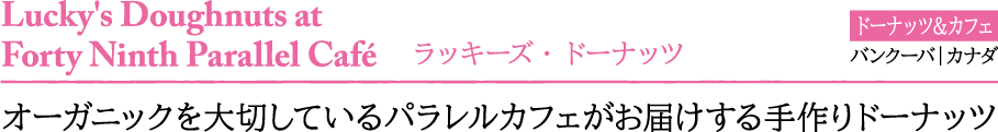 バンクーバーでベストを自負する自家焙煎コーヒーショップ、49th Parallel Coffeeが、5年の歳月をかけて生みだしたラッキーズ・ドーナツ。選び抜かれた最高の素材を使い、丁寧に手作りされています。ジャムやトッピングももちろんオリジナル。塩キャラメルやオールドファッション・ピスタチオなど旅の疲れを忘れさせてくれるスイーツの数々は、その日に作られた出来たてばかり。「コーヒーとドーナツ」、当たり前のような組み合わせですが、ここではワンランク上の味と品質を追求しています。自家焙煎された有機栽培の豆で淹れたコーヒーにピッタリな、こだわりのドーナツです。