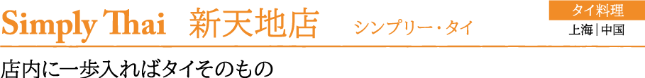 シノワズリーテイストのオシャレな雑貨で有名なSimply Lifeがプロデュースするタイ料理レストランです。フランス租界時代の建物を使ったコンチネンタルな雰囲気と、タイ伝統のインテリアを融合。上海にいながら、タイのリゾートに来たような気分が味わえます。料理はタイの正統派の味。青いパパイヤのサラダ・ソムタム(45元)は甘酸っぱさと辛さが絶妙に同居しています。ほかにもグリーンカレーやトムヤムクン、タイ風さつま揚げなど、代表的なタイ料理がずらりと。甘くて酸っぱくて辛い。そんな奥深いタイ料理の世界が広がっているのです。またデザートも人気です。おすすめはココナッツプディングの香■西米布丁(35元)。程よい甘さとココナッツの香りに、つい2個、3個と進んでしまいそう。東平路店をはじめ、上海に4店舗展開中。 ■:蘭の簡体字