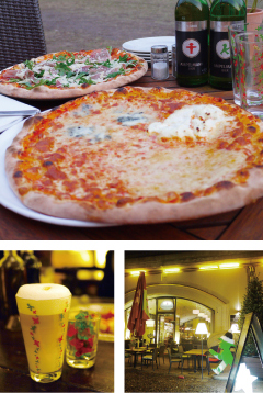 2007年にオープンした、旧東ドイツの信号マークのグッズ「アンペルマン」が経営するレストラン。シュプレー川岸の高架下にある店の前には芝生が広がり、夏はビーチチェアに座って、博物館島やベルリン大聖堂を眺めながら、ゆったりと食事を楽しむことができます。人気のメニューは、常時13種類が揃うアツアツの石窯焼きのピザ(7ユーロ〜)。ノンアルコールは「進め」、アルコール入りのピルスナータイプは「止まれ」の信号をデザインしたアンペルマンビール(3.90ユーロ)はピザにぴったり。「アンペルマン」の形のパンナコッタが入ったデザートバリエーション(1人前7.50ユーロ)などのスイーツも。高架下ならではの丸天井と、シンプルな木の家具でリラックス。ウィークデーの12時〜15時には6ユーロのリーズナブルなランチがあり、ミッテ散策の休憩におすすめです。