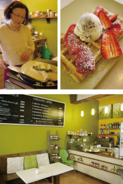 2009年にオープンした、焼きたてワッフルとクレープが評判のカフェ。オーナーのアデレ・ヴォセングさんが、オープンキッチンで焼いてくれるクレープやワッフルは、どれも優しい素朴な味わいです。手作りが大好きなアデレさん。店頭で販売しているフルーツや野菜のジャム、5種類ほどのクッキーなど、アイスクリーム以外は全て彼女の手作り。ベルギー風の甘くないワッフル(プレーン、2.50ユーロ)には、好みでアイスクリームやフルーツ、ソースなどをトッピングできます。ボリュームたっぷりのスープや、ほうれん草とチーズのクレープ(6.50ユーロ)など、気軽なランチにぴったりの食事メニューも充実。旬の野菜が多く取れるのも、旅行の時には嬉しいところ。グリーンを基調にした小さなお店には、学校帰りの子どもたちや、子連れのお母さんたちが足しげく通ってくるのです。
