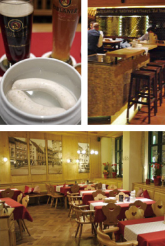オクトーバーフェスト6醸造所のひとつパウラーナービールを楽しむなら、こちらがおすすめ。マリエン広場に1450年に創業した古くから続くビアレストランで、創業当時から変わらぬ伝統を重んじながら、訪れる人々にあたたかく迎えてきました。その一方で、2009年に建物を改装し、壁面に歴史的な絵や快適な照明を設置しました。ここに来たらやはり、バイエルン地方の料理とビールで舌鼓。ミュンヘン名物の皮をむいて食べる白ソーセージ(ヴァイスヴルスト 4.8ユーロ)は、食べ方が分からない場合はスタッフが親切に教えてくれます。レバーケーゼという見た目はレバーソーセージでもレバーが入っていない不思議なネーミングのメニューは、ビールによくあい8.9ユーロ。入口にはその日のデザートを紹介するショーケースがあるので、食後にゆったりと楽しむのもいいでしょう。