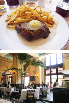 数多くのステーキハウスがあるダウンタウンの中でも、『Dine LA Dinners Award』などで受賞しているこの店は、ロサンゼルスのランドマーク的レストランとして有名です。店内には堂々とした雰囲気のダイニングルームと、歴史を感じさせる風格のある小部屋があります。清潔な白のテーブルクロスが優雅な印象を与え、セレブリティや、世界中の食を知るビジネスマン、そして美食家など、あらゆる人たちのお気に入りとなっています。乾燥熟成させたリブ・アイ・ステーキは、噛みごたえがありそうに見えますが、実際に食べてみると程良い柔らかさ。オーク材で焼いた際の焦げ目と、ふわりと鼻をくすぐるいぶした香りが、より一層、食欲をそそります。ダイニングでの落ち着いた食事もいいものですが、テラスのテーブル席で、新鮮な空気を吸いながら楽しむカクテル&ディナーもおすすめです。上質な素材を使った料理と最高のおもてなしが、きっと素敵な旅の思い出を残してくれます。